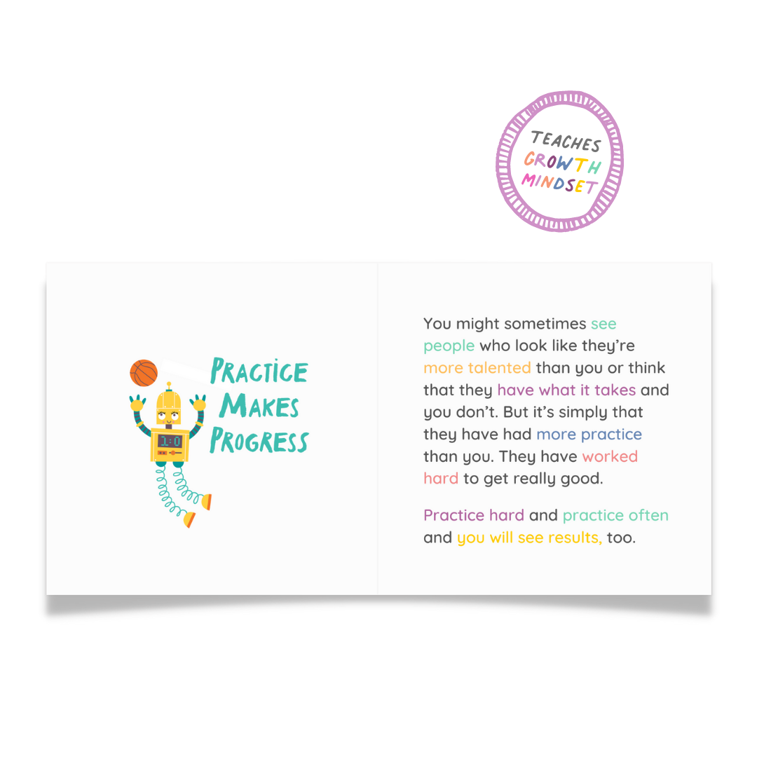 The certified compostable sticker comes with a card that explains that people get skilled at things through consistent practice and not innate talent. This important concept shows kids that they can develop any skills they want with hard work and perseverance.